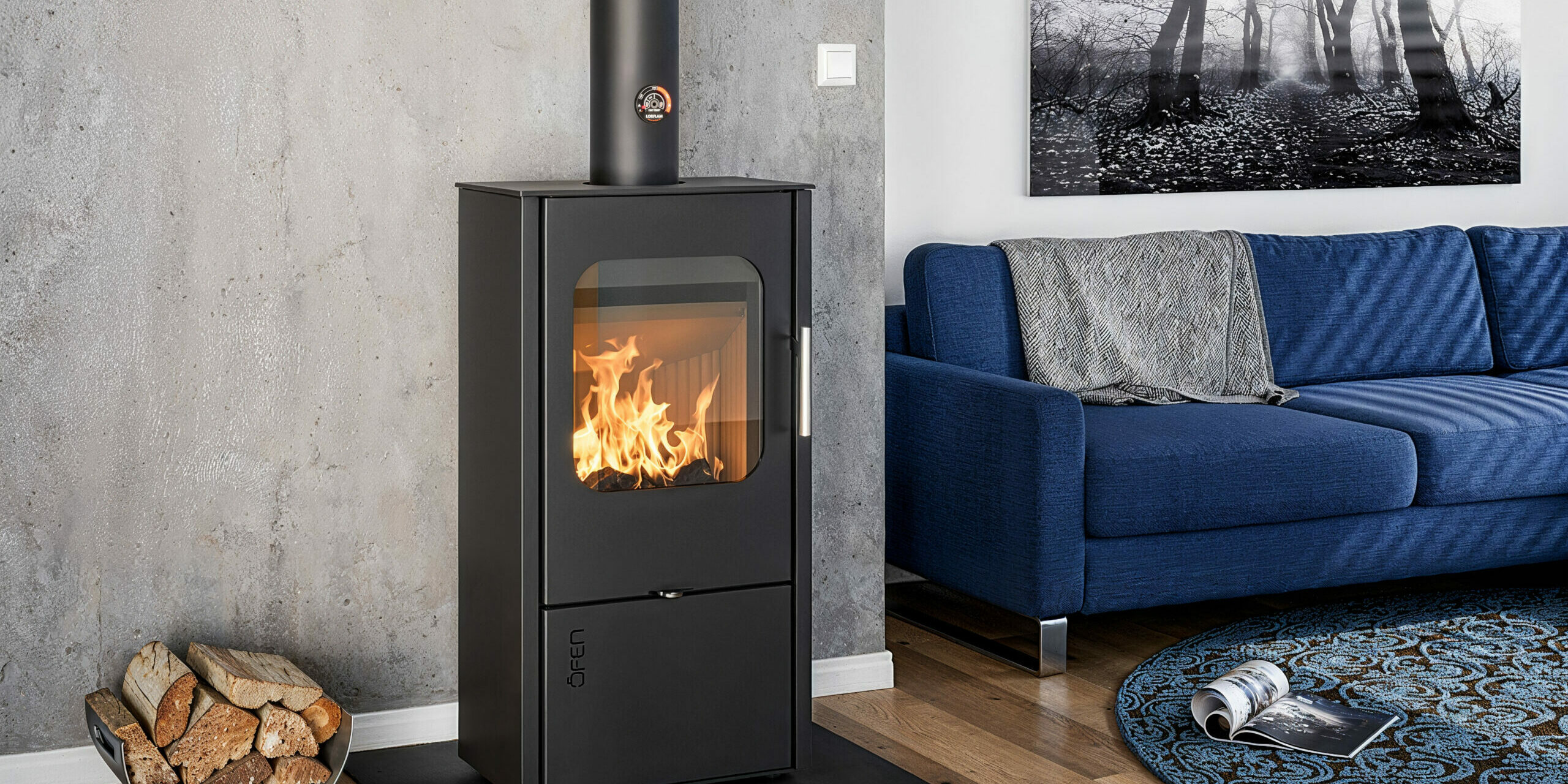 Le poêle à bois OFEN 12/V2 de LORFLAM est un poêle à structure acier et intérieur intégralement doublé en chamotte haute densité.